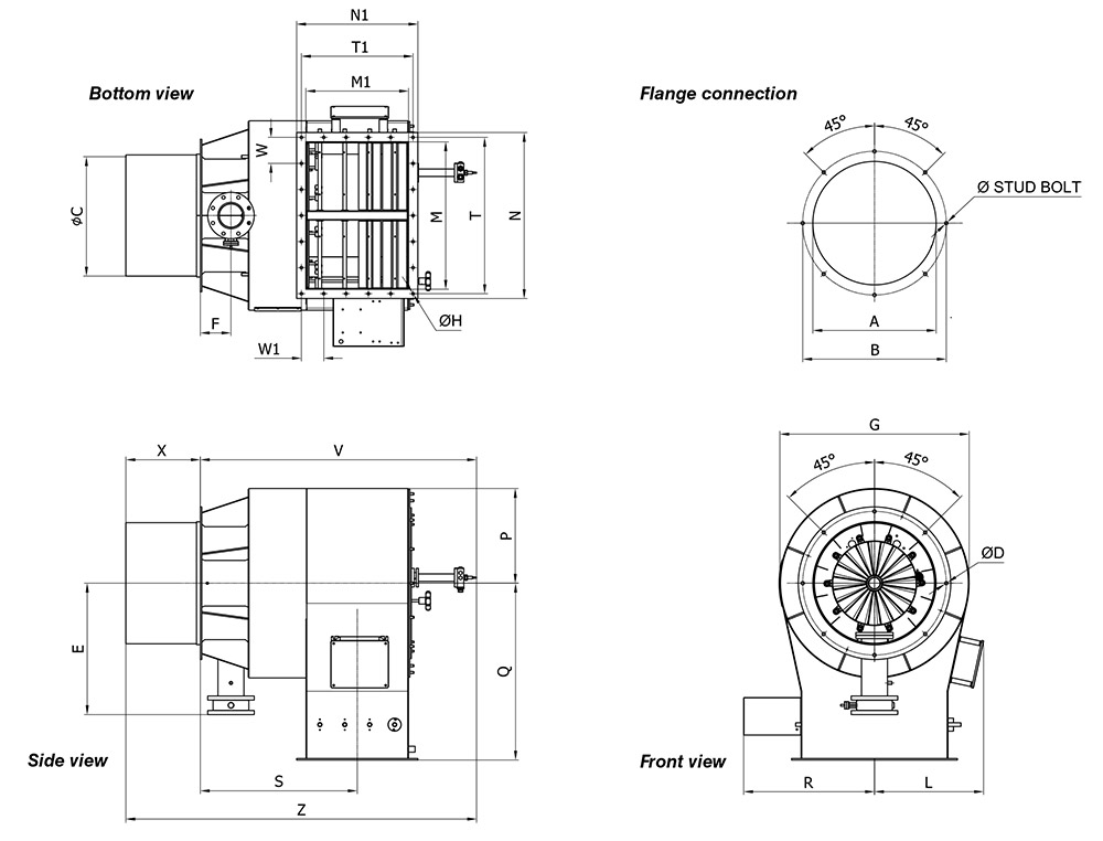 | A | B | C | øD | E | øH | L | G | M | M1 | N | N1 | P | Q | R | S | T | T1 | V | W | W1 | X | Z | ø STUD BOLT |